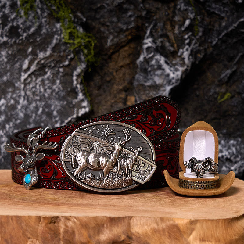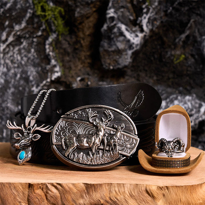 - Confezione: 1 fibbia per coltello con bandiera di cervo, 1 collana di alce, 1 anello di capra regolabile con 1 scatola per anello da cowboy