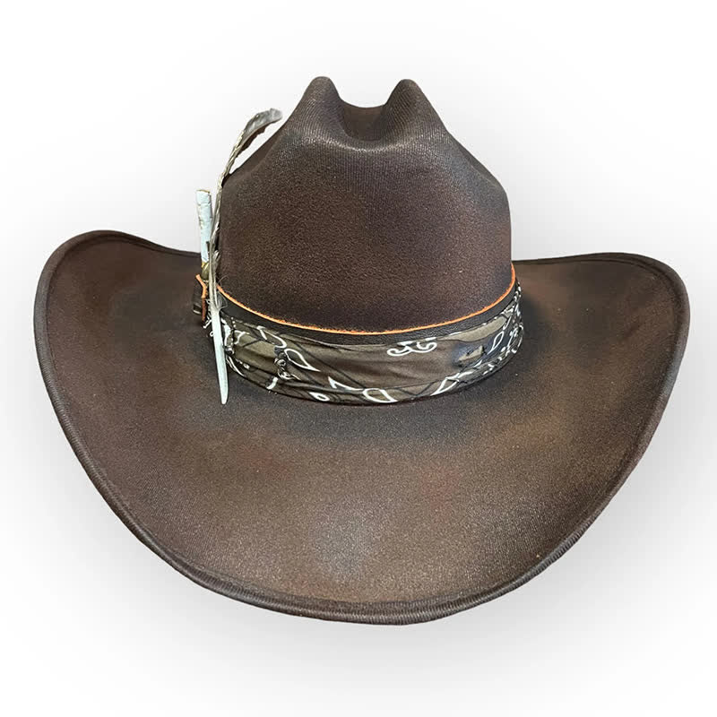 - Questo cappello da cowboy rockstar marrone è semplicemente fantastico, il tessuto paisley e la grande piuma lo rendono una storia da raccontare.