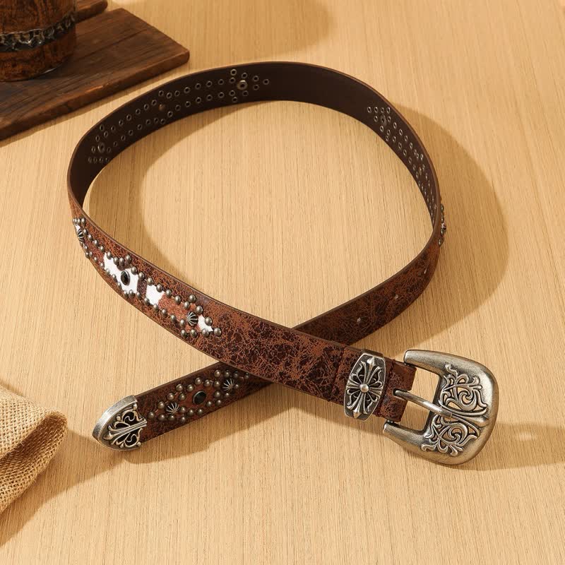 Questa fantastica cintura da donna è realizzata in pelle marrone e giunzioni in pelliccia sintetica. È perfettamente impreziosita da rivetti in bronzo che presentano un disegno a forma di freccia.