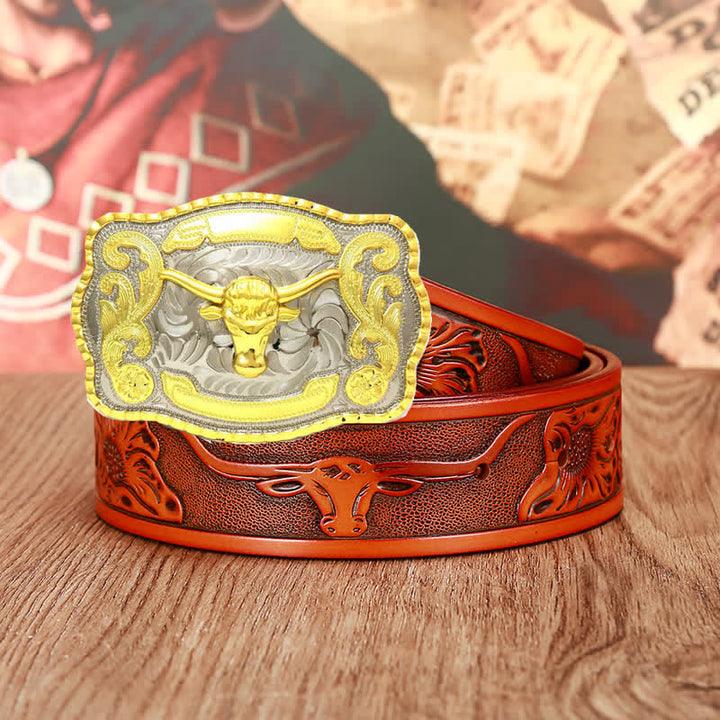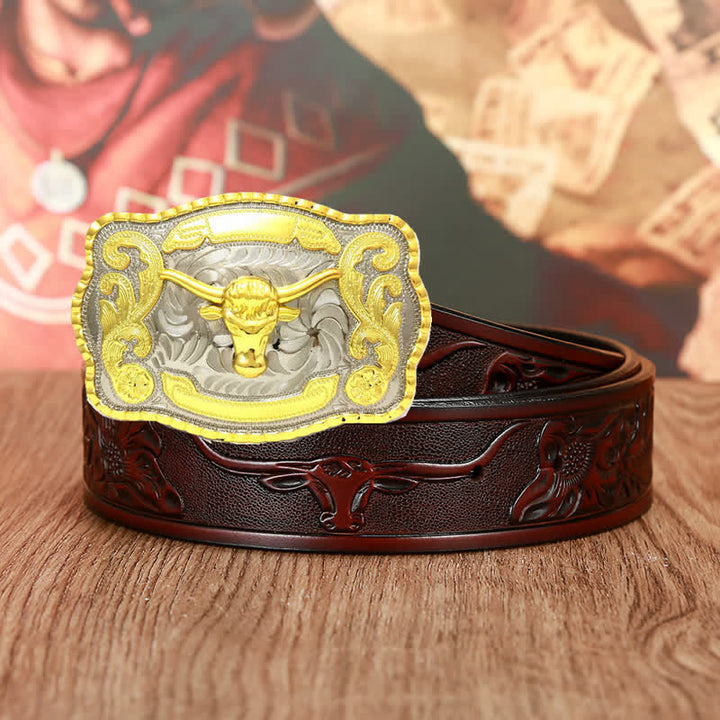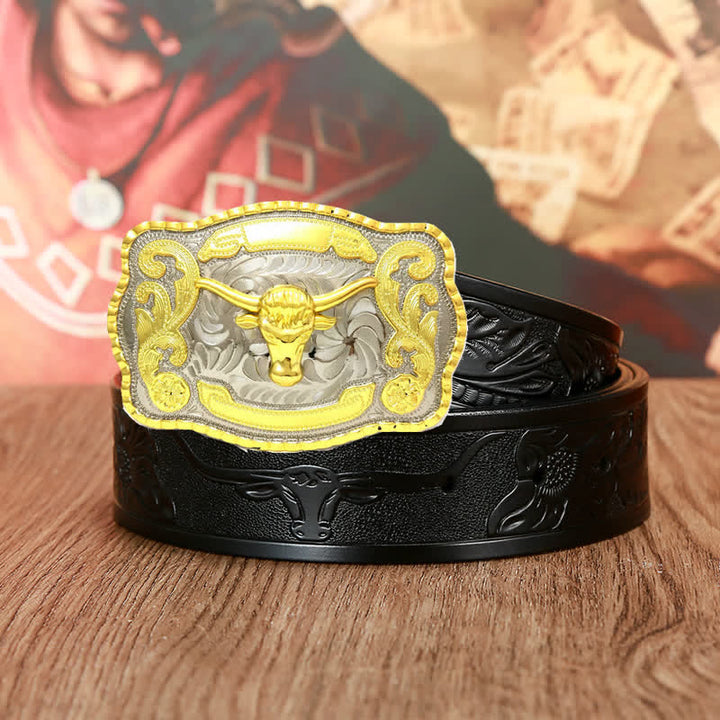Cintura con motivo a testa di toro in rilievo e fibbia con motivo a testa di toro dorato, classica e splendida, molto adatta per l'uso quotidiano, per mostrare il tuo fascino.