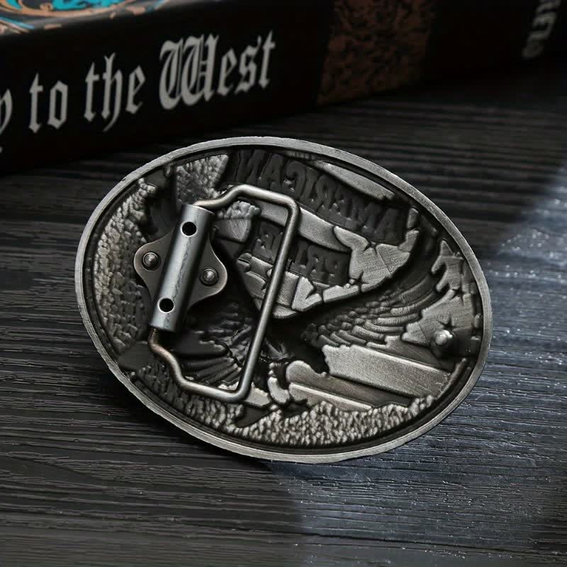 La fibbia presenta un'aquila 3D che domina la bandiera americana. Chiaramente visibile sulla parte anteriore della fibbia, troverete un'aquila calva americana placcata in oro con le ali completamente estese.