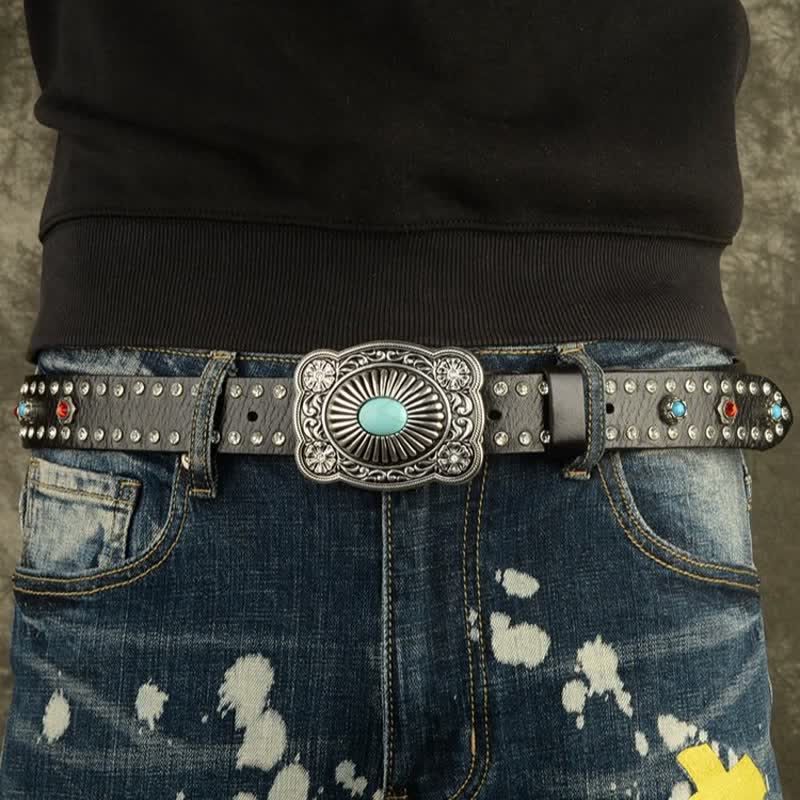 Funzionalità e carattere si uniscono in questa cintura western decorata con pietre colorate. Presenta una fibbia rettangolare in metallo con una grande pietra turchese sintetica al centro, che crea uno straordinario contrasto con il cinturino in pelle neutra.
