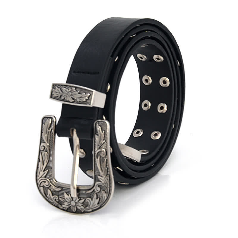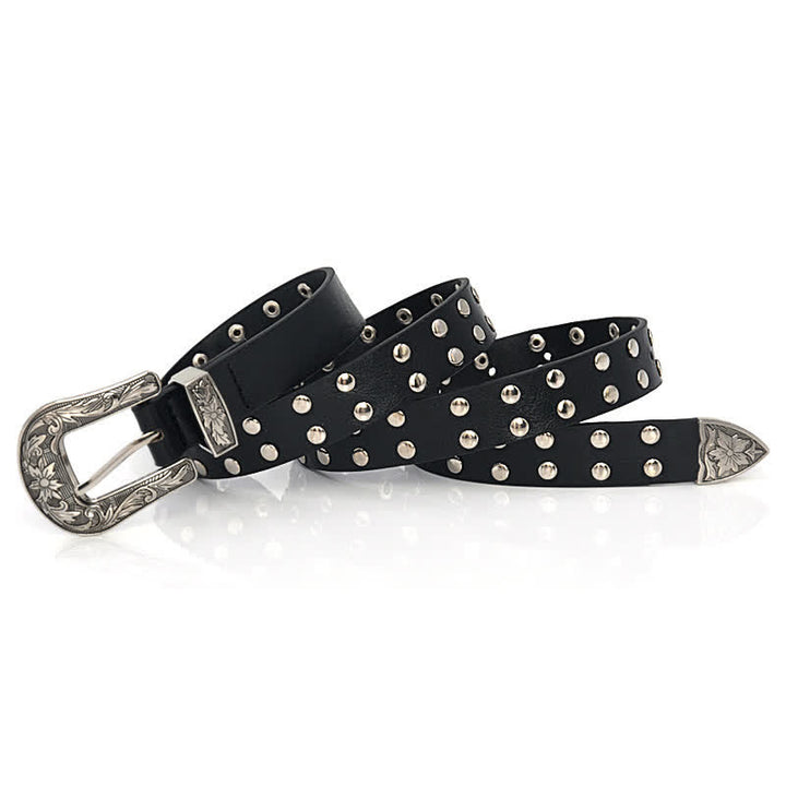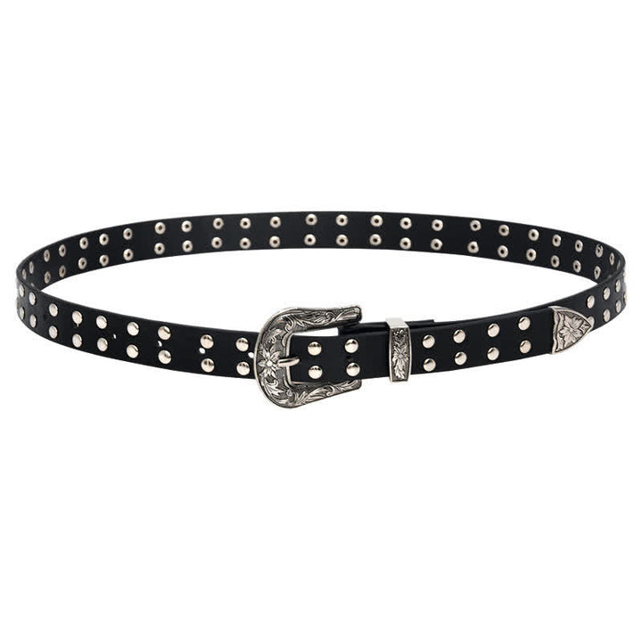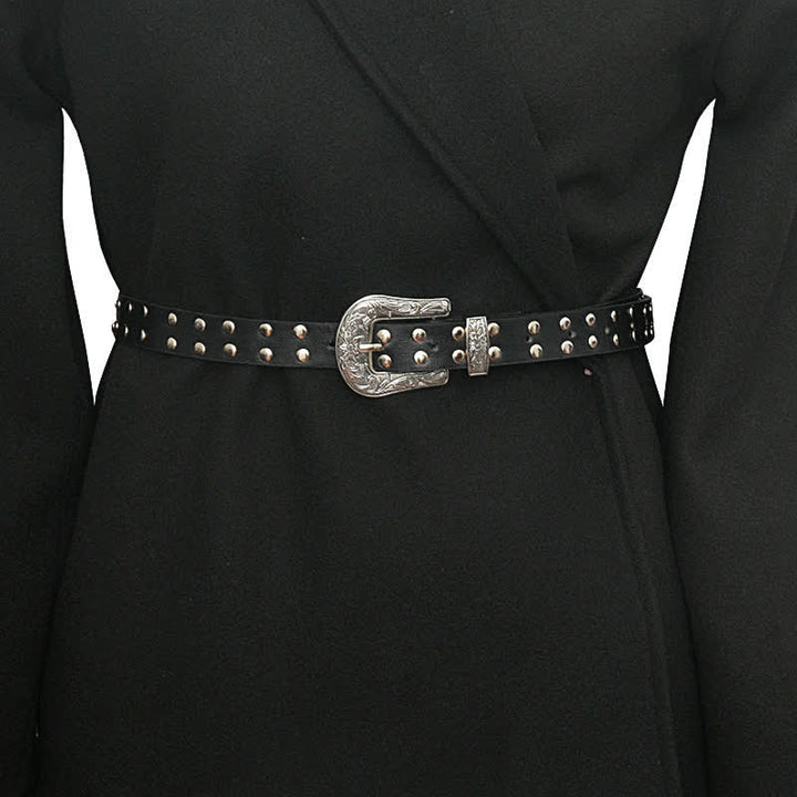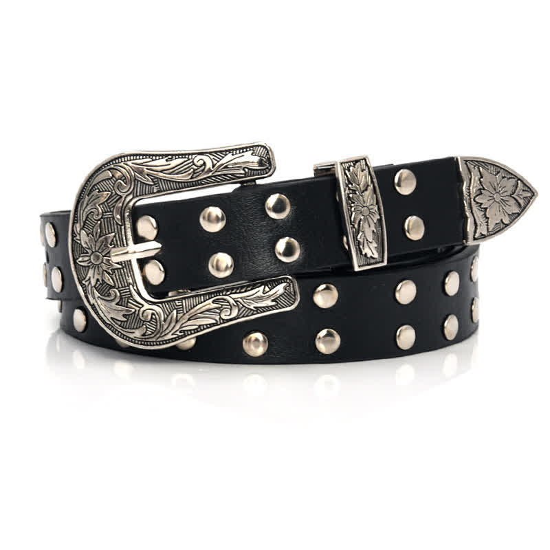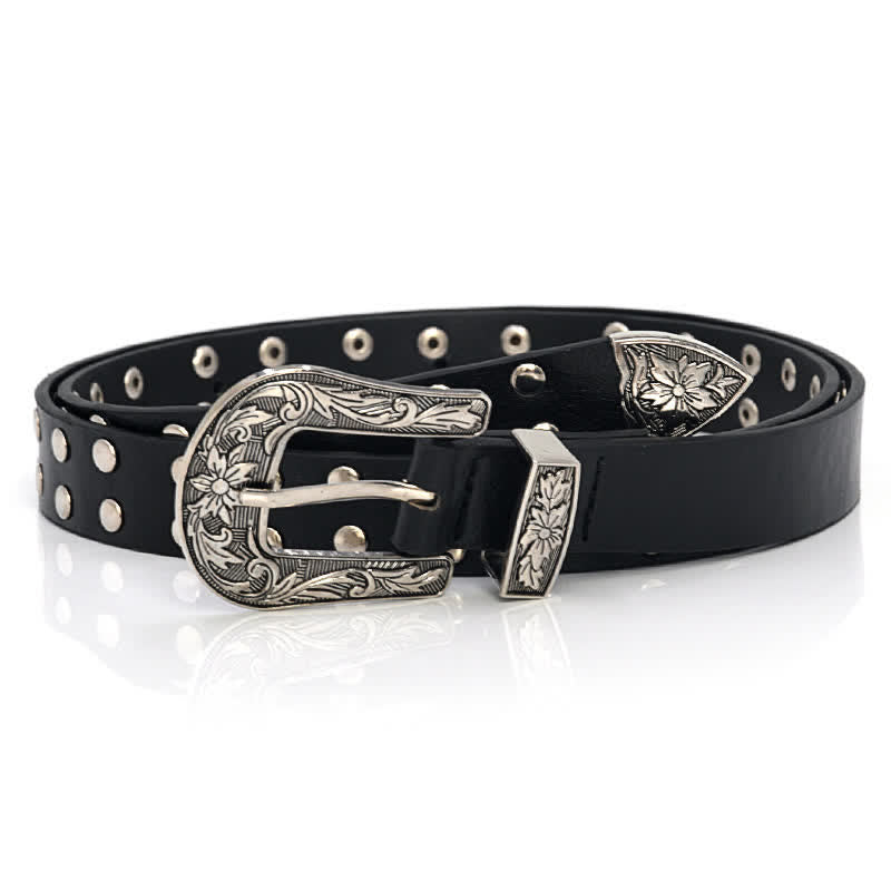 Questa cintura sottile presenta una fibbia floreale intagliata e hardware borchiato in argento che decora tutto il cinturino in pelle. Scegli questa cintura borchiata con rivetti per creare uno stile adatto a un'occasione formale e un'uscita casual.