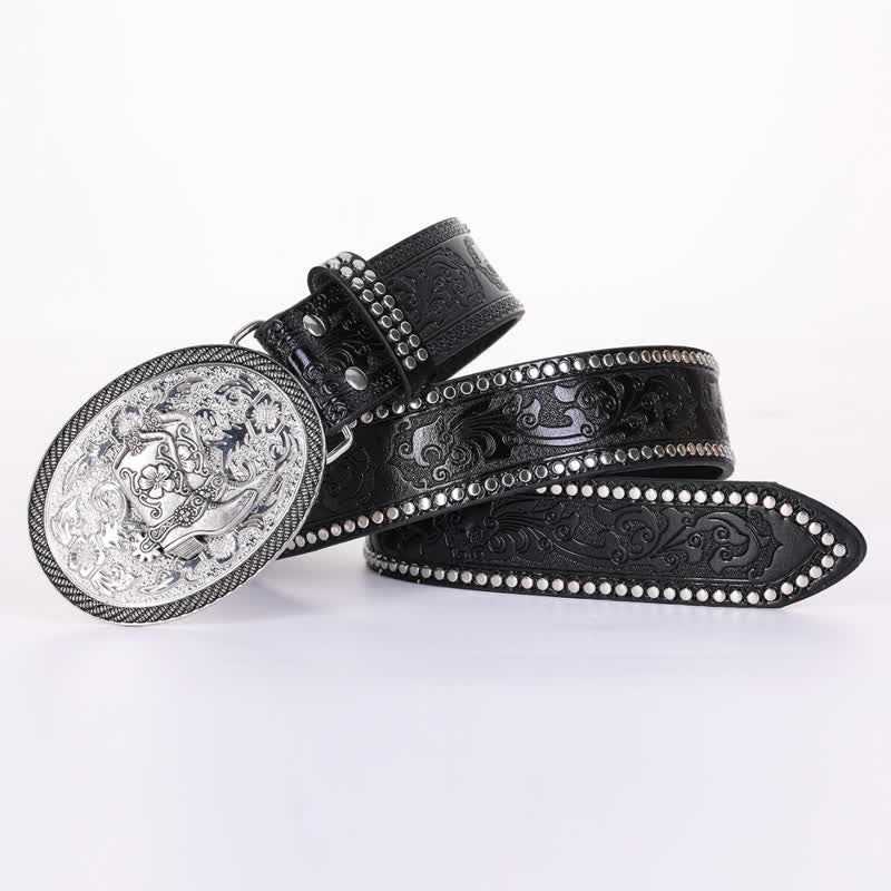 Il design vintage in rilievo sul cinturino aggiunge un tocco di eleganza unico alla cintura, rendendola un accessorio perfetto per le occasioni eleganti. La fibbia argentata dello stivale è dettagliata e ben definita, facendo risaltare la cintura.