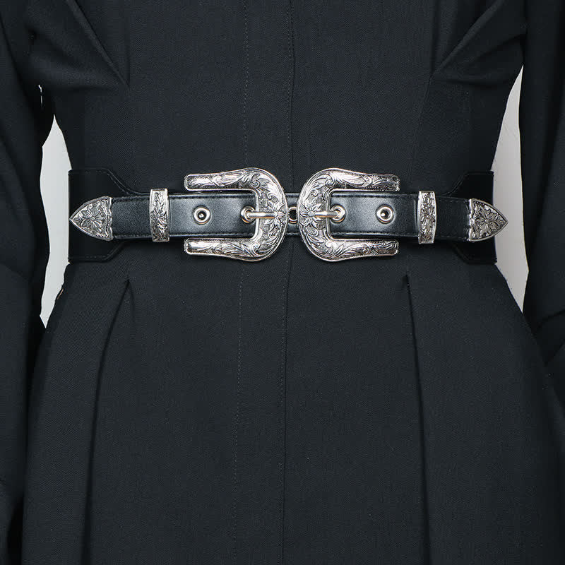 Realizzata in morbida pelle con doppia fibbia in lega e classica incisione floreale, questa cintura western valorizza la vita per un look elegante . Gli elastici elastici presentano una parte anteriore in pelle vegana con due fibbie incise al centro e cinque fori di regolazione. Due bottoni automatici sul retro. La cintura misura 71 cm di lunghezza (indossata rilassata).