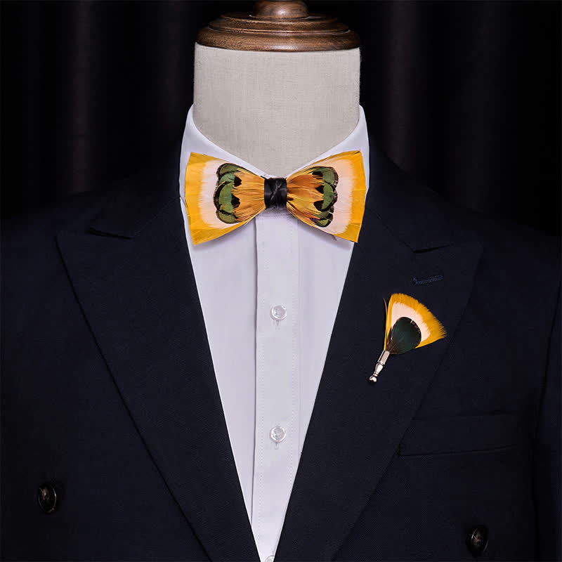 - Caratteristiche: L'uso di una combinazione di piume di fagiano gialle e di piume d'oca bianche e verdi per creare il motivo vivace e splendido di questo papillon, conferisce ad ogni pezzo finito una colorazione unica.