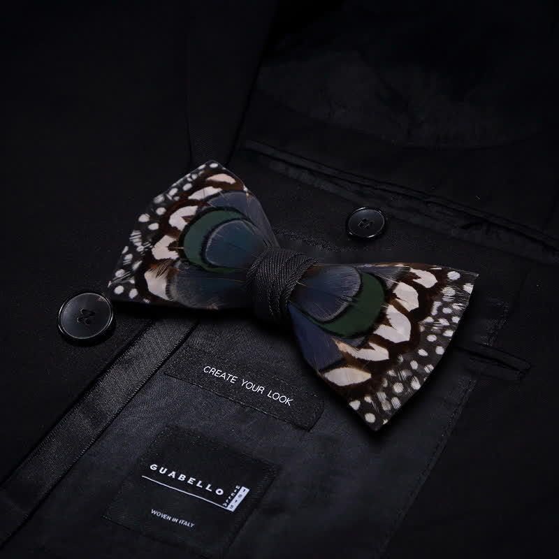 - Caratteristiche: Mettendo in risalto la forma naturale delle piume d'oca blu, in contrasto con le piume di faraona bianche e nere, questo papillon simmetrico offre giusta la dose di stile unico e accattivante.
