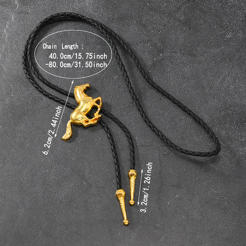 Questa cravatta bolo con l'emblema del cavallo al galoppo presenta un design dinamico e vivace, incentrato su un emblema scolpito in 3D con finiture in metallo oro e argento lucido. La squisita lavorazione artigianale in metallo vintage mette in risalto l'elegante texture del motivo del cavallo, mentre il cordino intrecciato nero liscio e le estremità riccamente decorate garantiscono una vestibilità comoda e sicura. Aggiunge un fascino unico, elegante e nostalgico sia agli abiti in stile retrò che ai look casual quotidiani con un tocco raffinato.