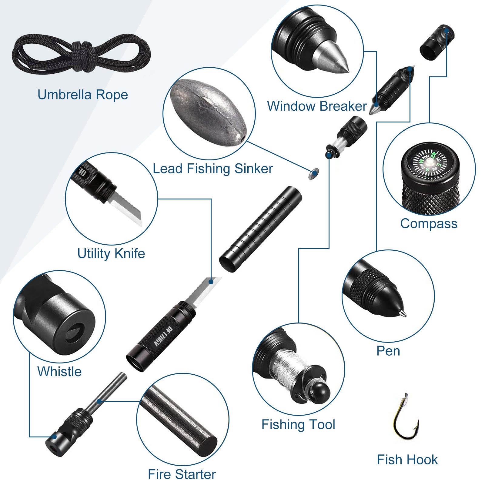 • Realizzato in lega di alluminio di livello militare con una finitura anodizzata resistente, questo strumento compatto è dotato di una penna a sfera affidabile, un coltello di precisione, un rompivetro, un apribottiglie e persino innovativi strumenti da pesca, tutti sapientemente nascosti in un elegante design a penna.
