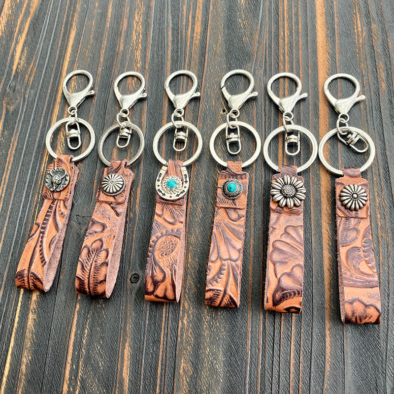 Portachiavi in pelle con fiore intagliato in stile punk