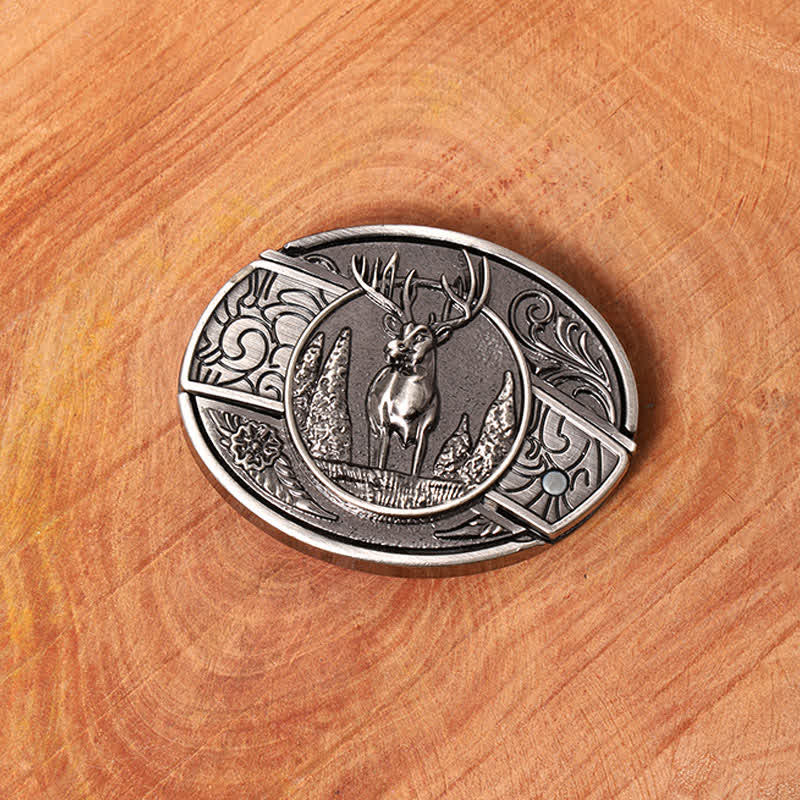 • Questa fibbia classica presenta una scena di cervo nella foresta.