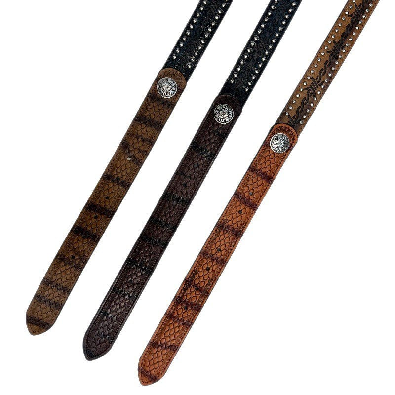 - Questa cintura è realizzata in tessuto con motivo a serpente, dalla consistenza unica e dall'atmosfera selvaggia; il lato è decorato con rivetti e abbinato a fibbie con ago in argento vintage con motivo vintage;
