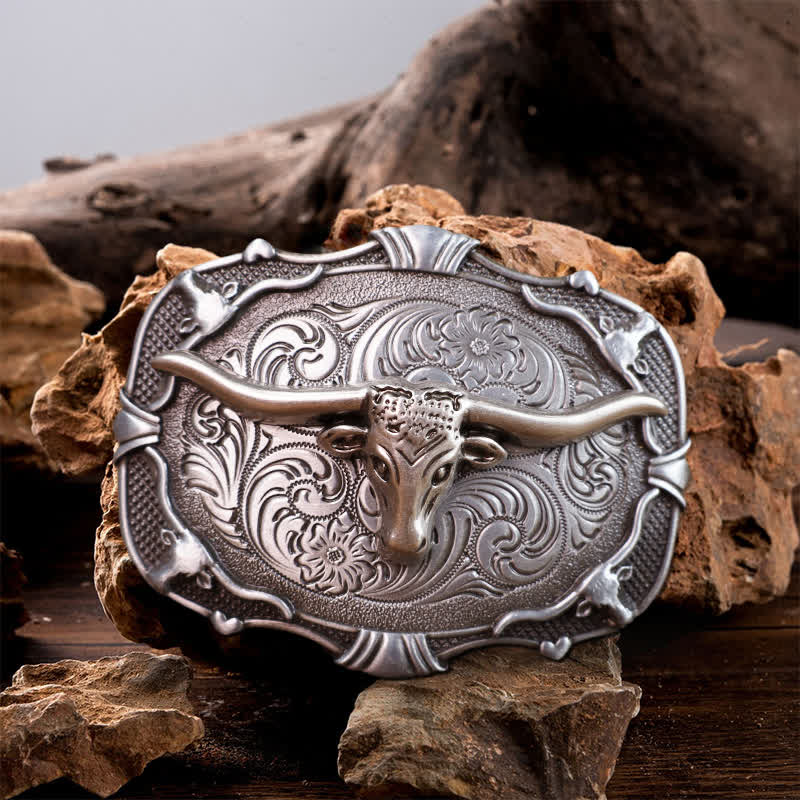 Questa lunga fibbia per cintura raffigura un toro dalle corna e una testa di toro capovolta incastonata in ogni angolo, simbolo di ricchezza, onore e coraggio. Indossala per mostrare lo stile western.