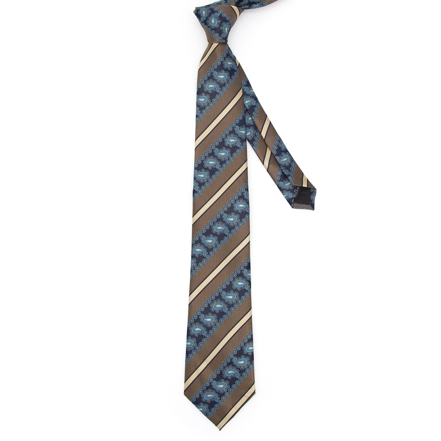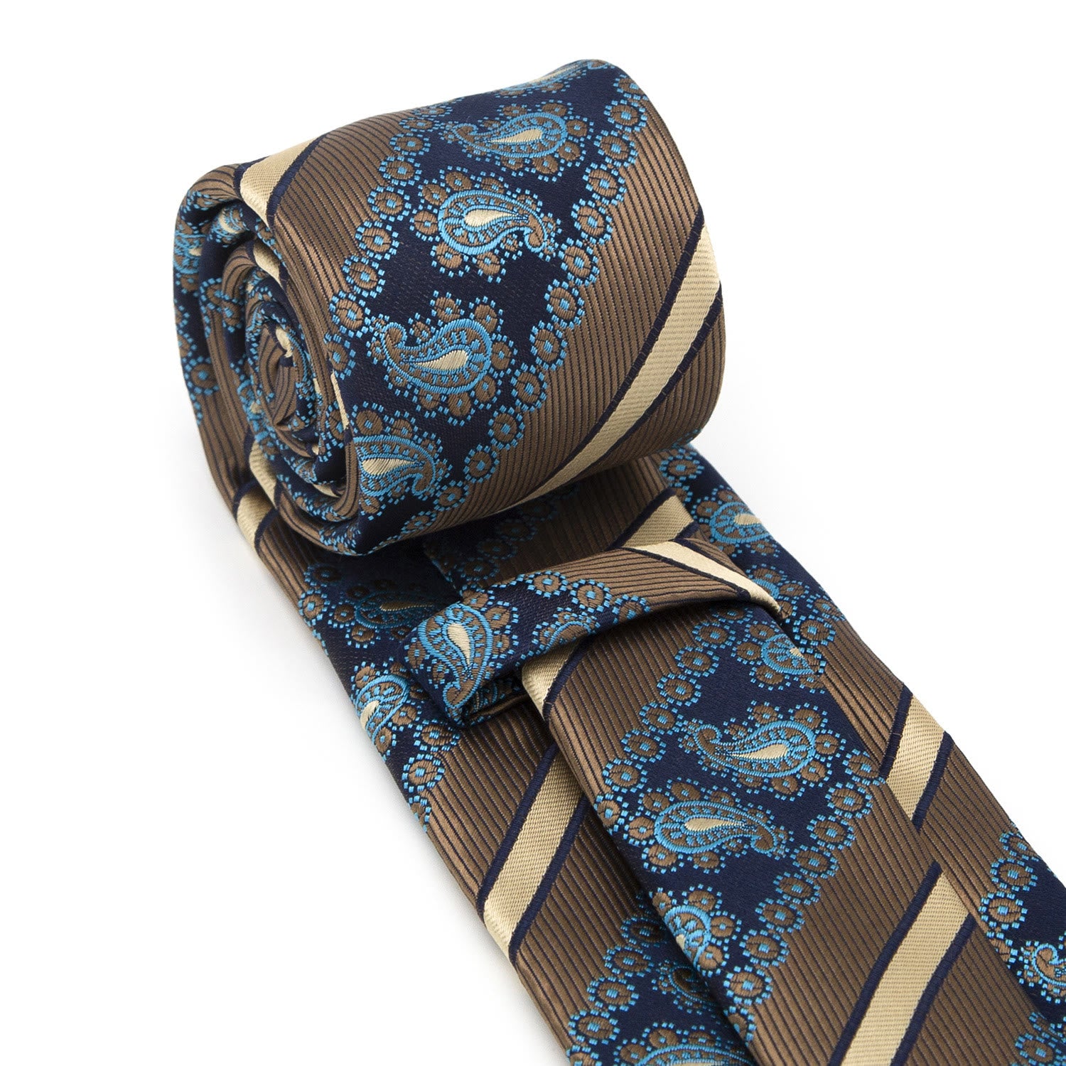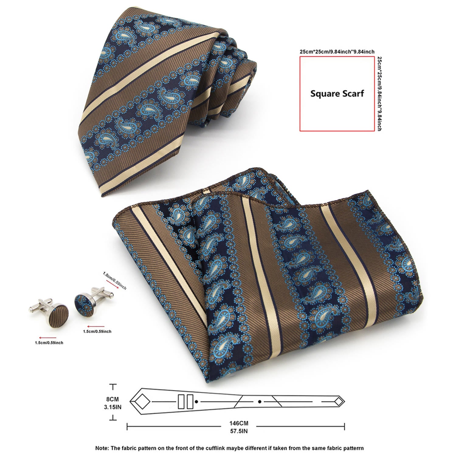 Il set include un'elegante cravatta, un fazzoletto da taschino abbinato e gemelli raffinati, tutti caratterizzati da un sofisticato motivo a righe marroni abbinate a motivi paisley blu navy. Perfetto come regalo o per rinnovare il proprio guardaroba: stile disinvolto in un set completo.