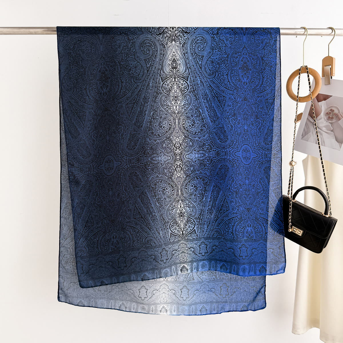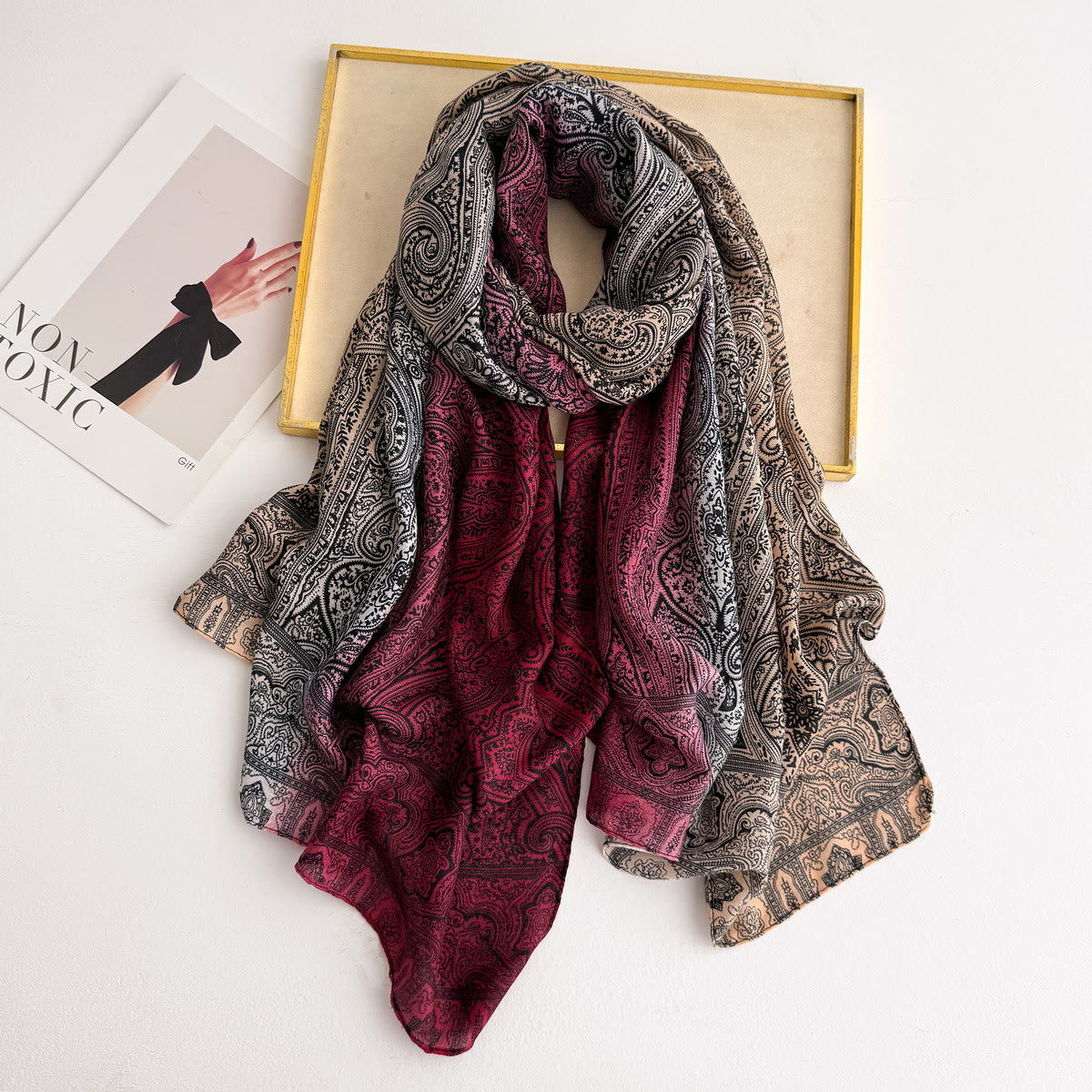 Realizzata in tessuto leggero e trasparente, questa sciarpa presenta intricate stampe paisley con dettagli tonali sovrapposti che emanano un'atmosfera classica e raffinata. Il suo morbido drappeggio e la texture traspirante garantiscono un comfort ideale in tutte le stagioni. Puoi indossarla come scaldacollo, come scialle da spalla o come accessorio per borse per impreziosire il tuo look. È anche un regalo ideale per chi preferisce accessori decorativi senza tempo per le occasioni speciali.