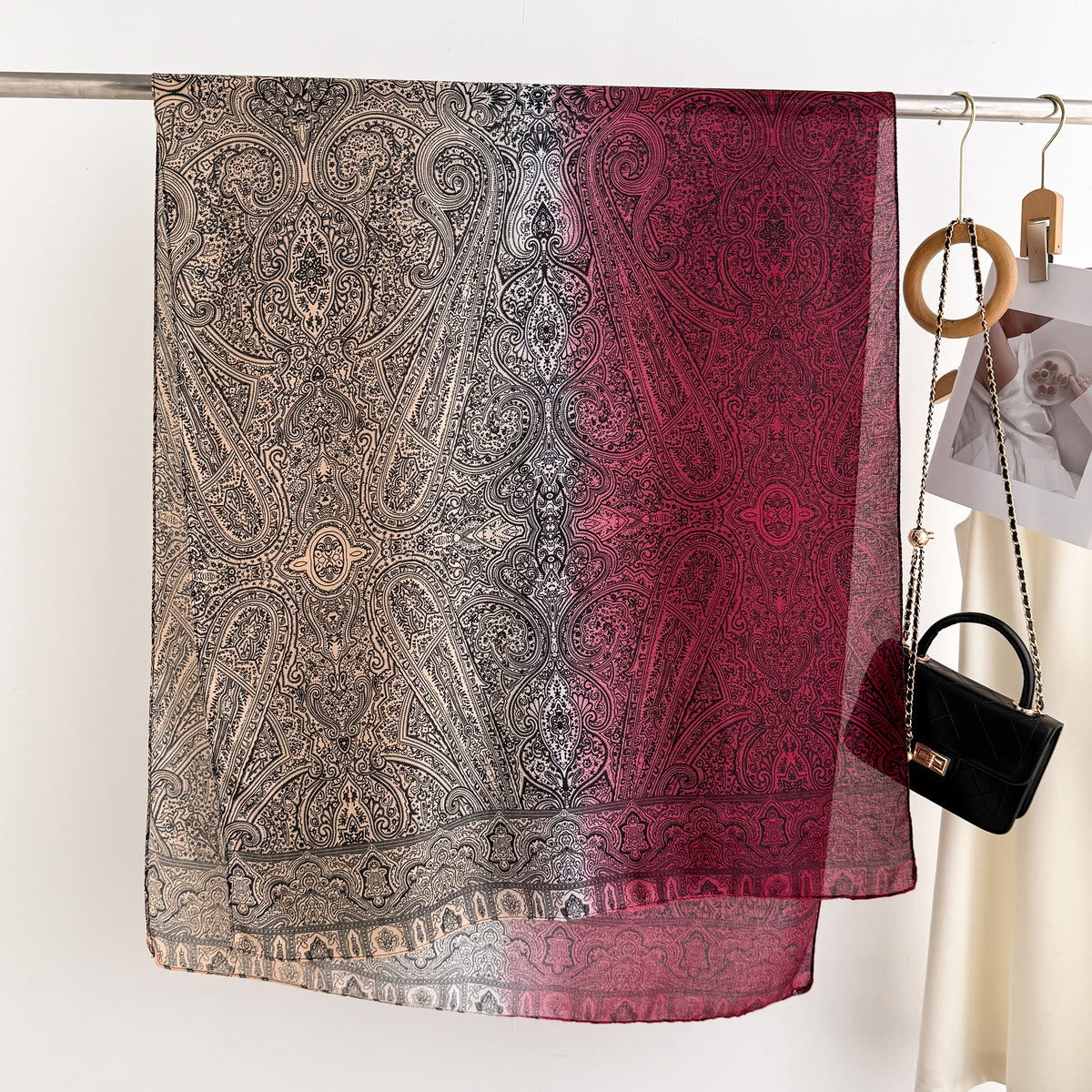 Questa sciarpa vanta elaborati motivi paisley vintage e una texture leggera e trasparente, che donano un tocco di eleganza senza tempo al tuo stile. È perfetta per le commissioni quotidiane, le uscite del fine settimana e gli eventi semi-formali.