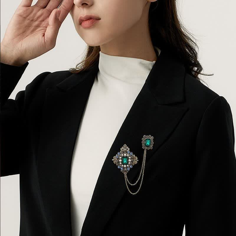 - Incastonato in tonalità oro con perle artificiali e cristalli nei colori blu fumé, marrone fumé e verde smeraldo, il tutto unito da due catene.