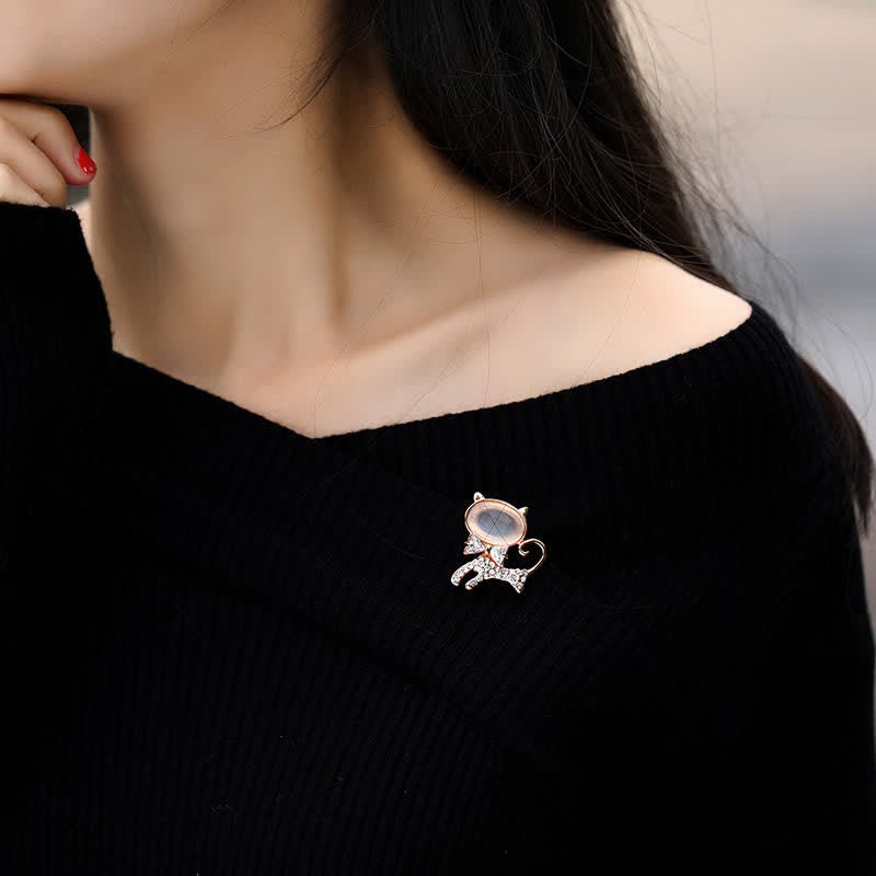- La spilla è realizzata in metallo e raffigura un simpatico gattino che corre e indossa un fiocco di strass trasparenti.
