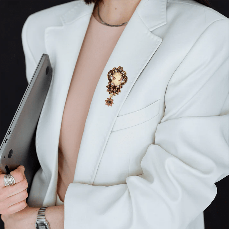 - Per gli amanti dei cammei classici, questa spilla con cammeo antico e fiore è la scelta giusta.
