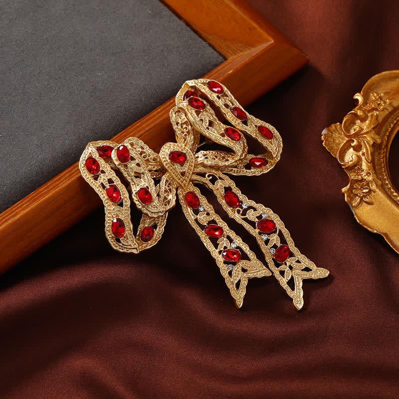 - È caratterizzato da un fiocco di nastro metallico elegantemente ondulato, impreziosito da un sorprendente dettaglio in pietra rossa.