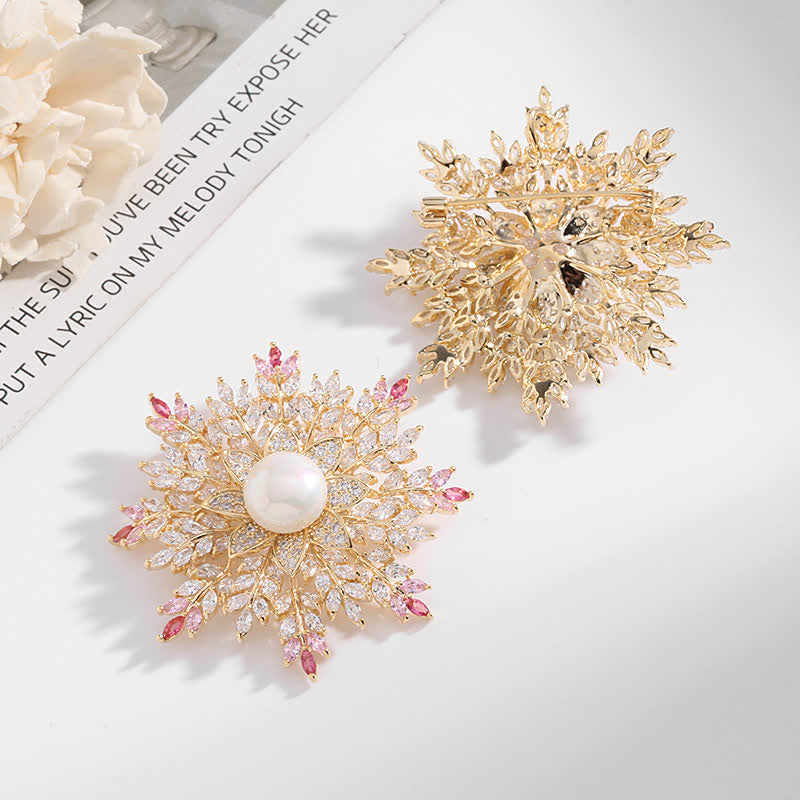 - Con design a fiocco di neve, al centro una perla rotonda, impreziosito da diamanti rotondi e rami dorati testurizzati.