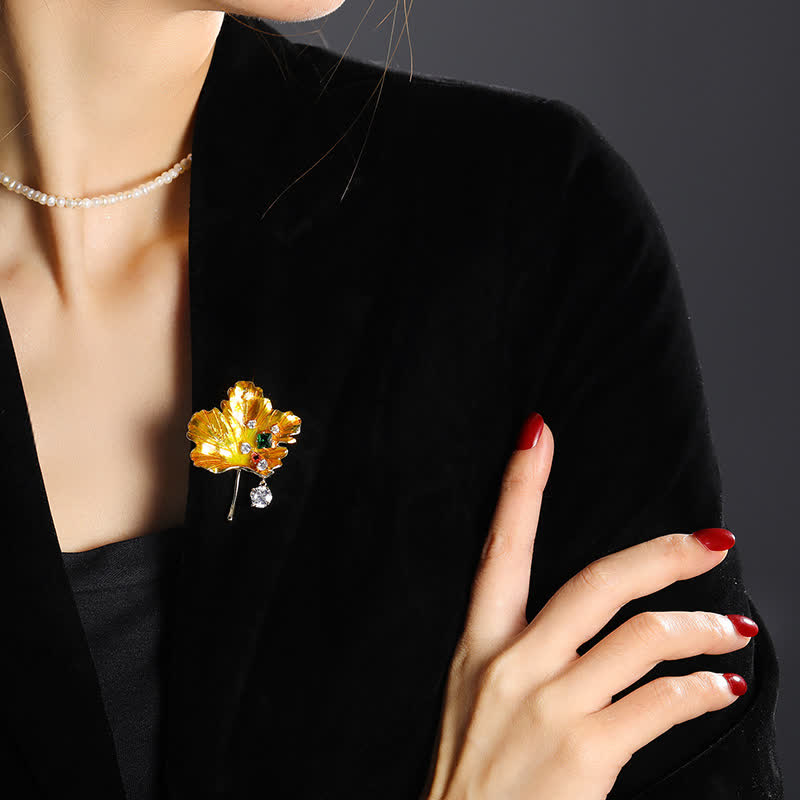 - Una spilla a forma di acero, incastonata sulla foglia con diversi zirconi bianchi, verdi e rossi.
