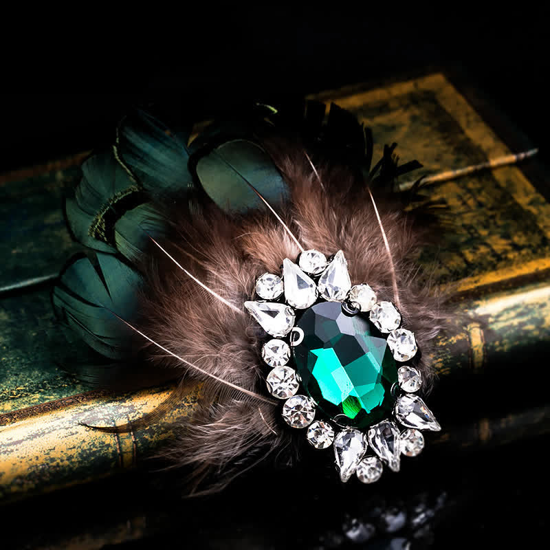 - Elegante e naturale spilla con piuma verde scuro, accessori con strass cuciti a mano.