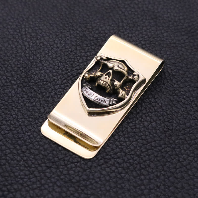 Fermasoldi in ottone con teschio 3D Good Luck