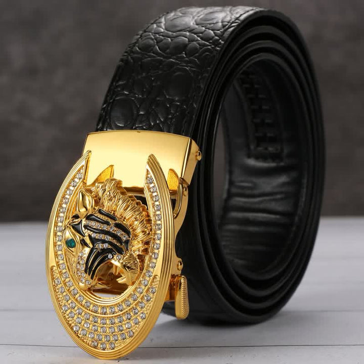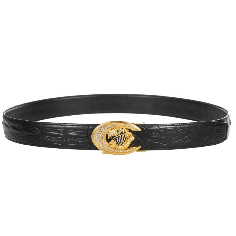 - Se vuoi mettere in mostra di più il tuo fascino, una cintura scintillante e senza tempo con fibbia a forma di testa di tigre è la scelta migliore.