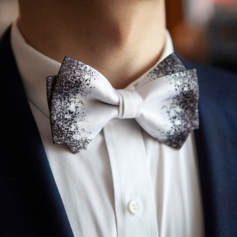 - Questo fiocco papillon bianco o nero è semplicemente sbalorditivo! Il motivo a forma di cielo stellato con schizzi di inchiostro sui lati crea un effetto perfetto.