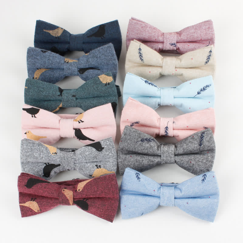 - Questi papillon blu, caratterizzati dal grazioso motivo a uccelli e piume, sono classici e senza tempo.