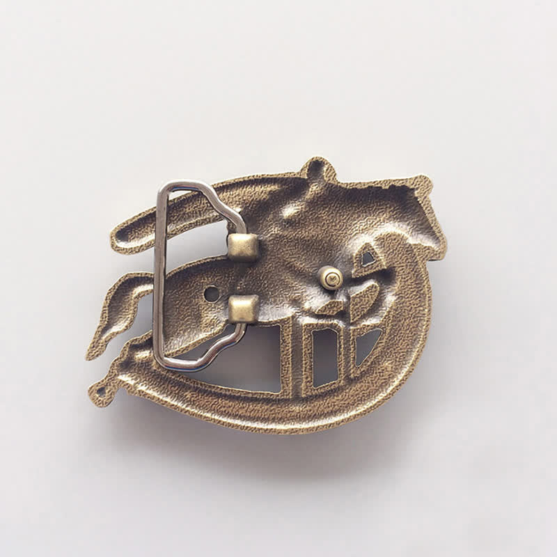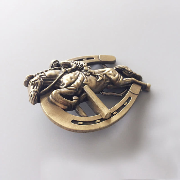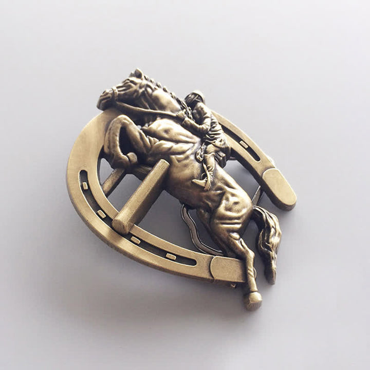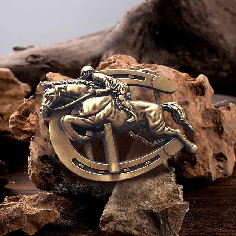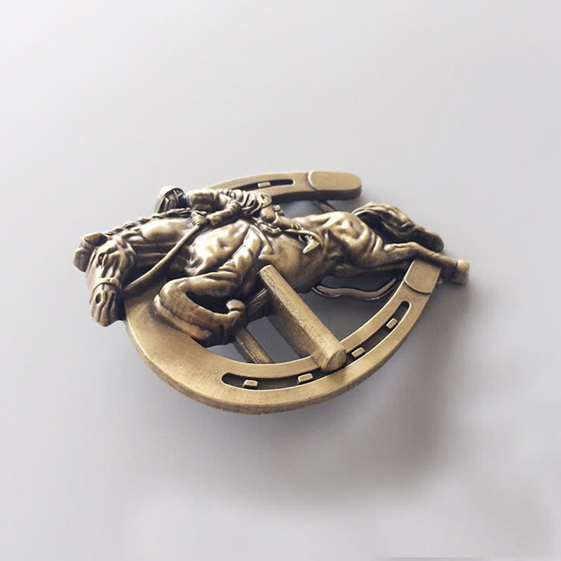 Via alle corse! Il cavallo e il fantino sono scolpiti e inseriti in una cornice a ferro di cavallo da corsa. È una fibbia 3D con bei dettagli.
