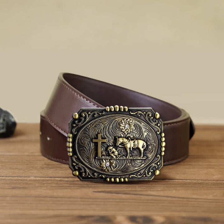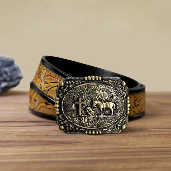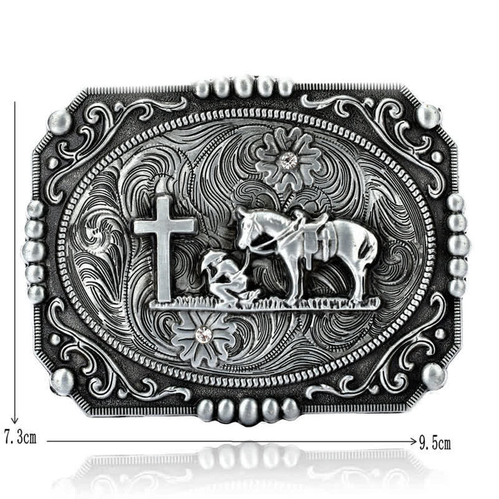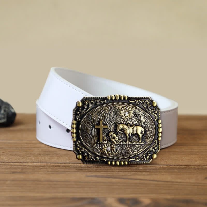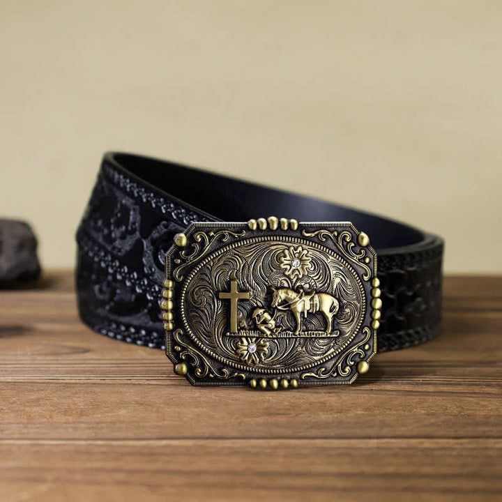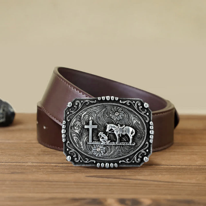 Ci sono motivi a croce, cavallo e persona in preghiera sulla testa della fibbia della cintura, classici e bellissimi. È un accessorio ideale per gli uomini, da indossare come cintura in pelle per tutti i giorni.