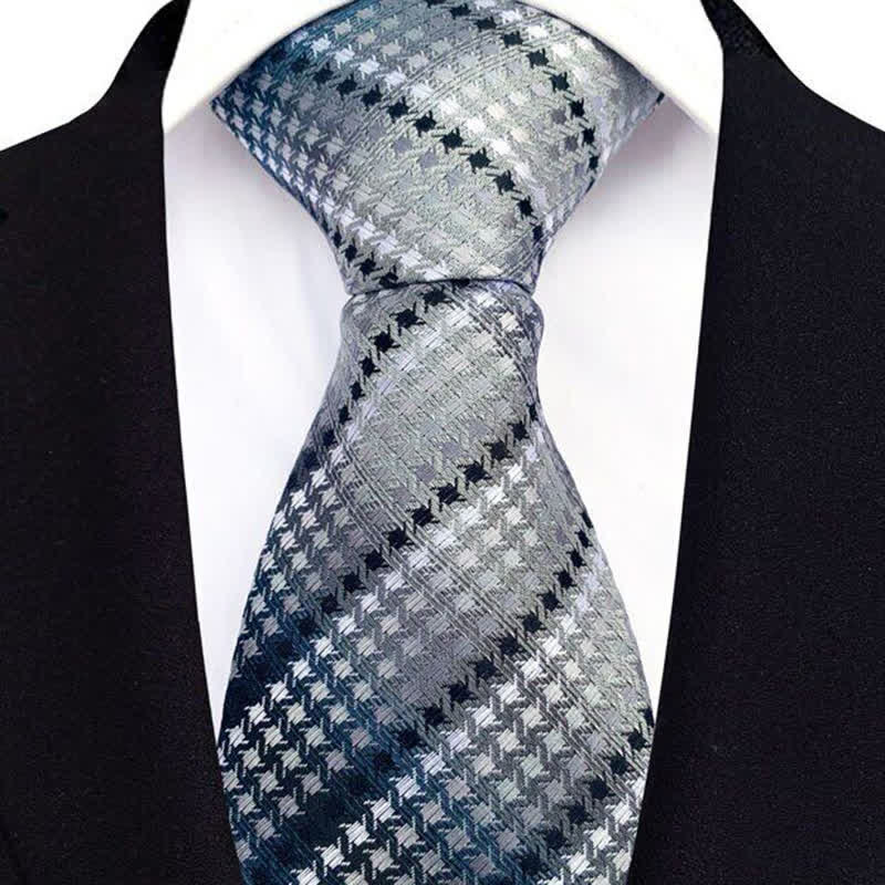 Aggiungi un po' di brio urbano di alto stile al tuo stile di abbigliamento con questa cravatta a righe elegante e raffinata in eleganti tonalità di argento, grigio e nero. Le eleganti righe diagonali e il motivo pied de poule lavorano insieme per creare una cravatta incredibilmente versatile.