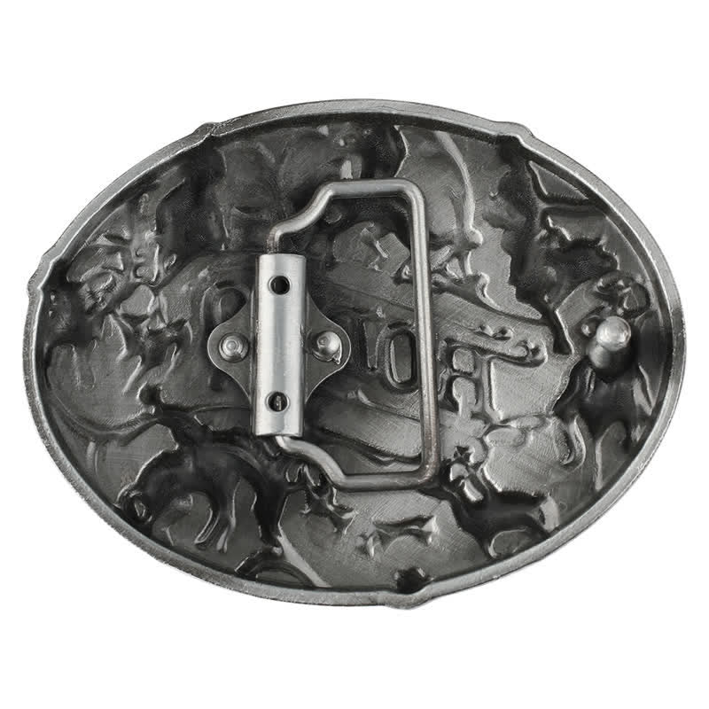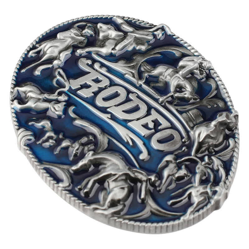 Questa fibbia per cintura celebra il rodeo con la scritta "Rodeo" in grassetto al centro e raffigurazioni dei sette eventi del rodeo che la circondano con un bordo di corda. La fibbia è impreziosita da smalto blu.