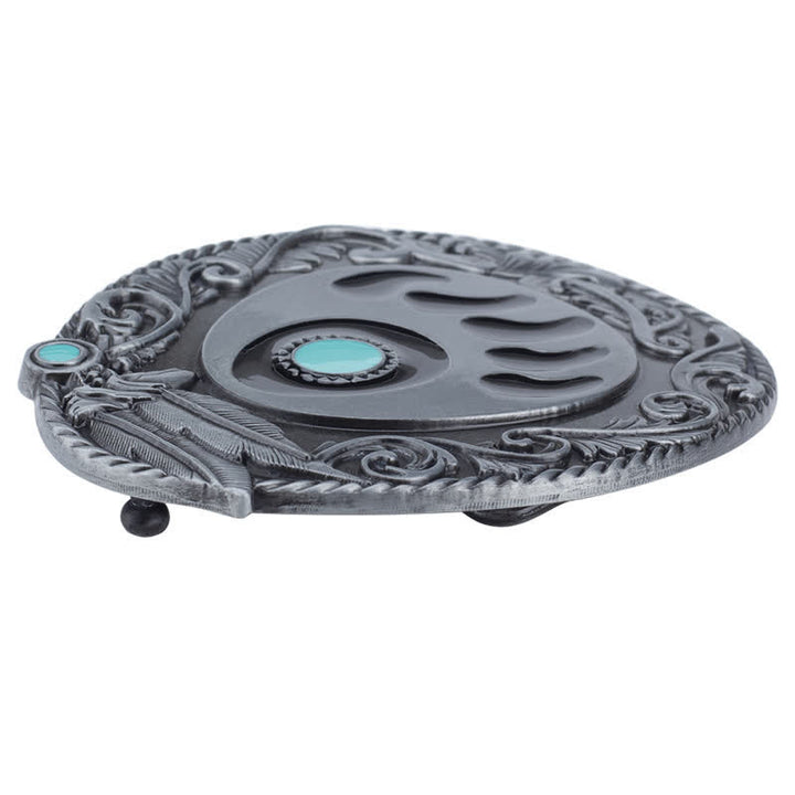 Questa è una fibbia da cintura in stile western da cowboy americano retrò in argento. La fibbia color argento presenta un motivo a zampa d'orso al centro, un motivo a fiori e viticci decora il bordo. Adatta per un uso quotidiano.