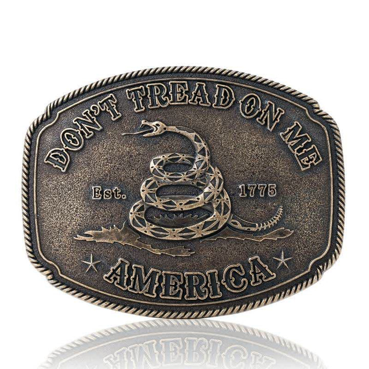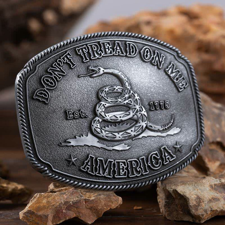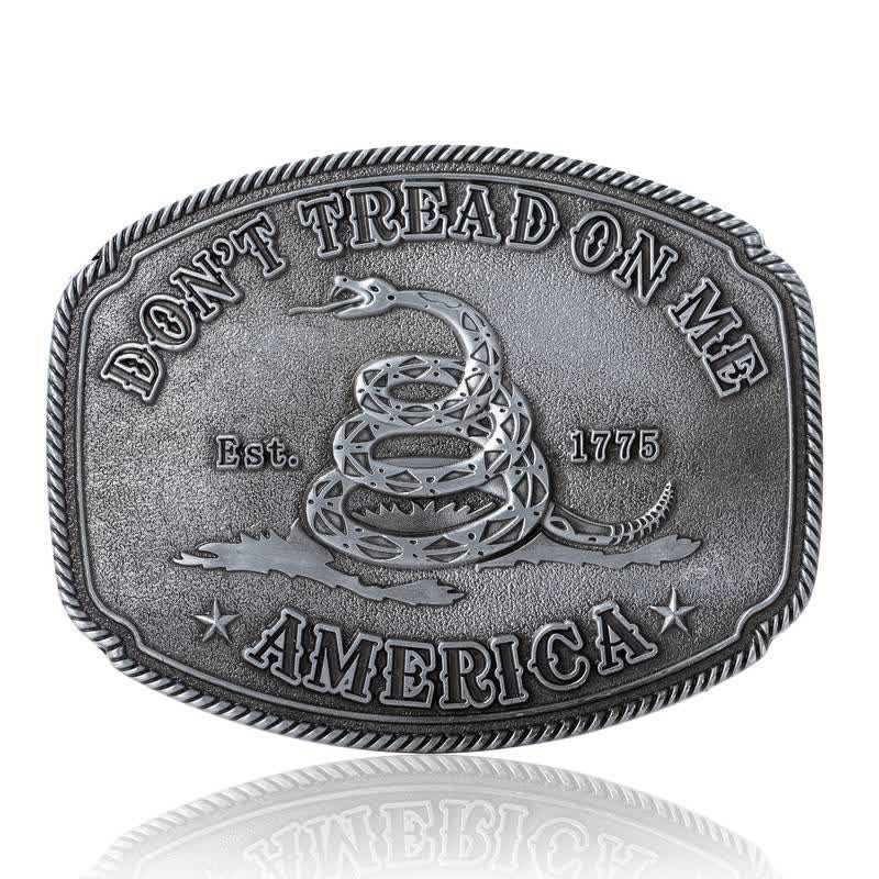 La fibbia per cintura dalla forma geometrica presenta un bordo liscio con un serpente e le parole "Don't Tread On Me" nella parte superiore. Questa fibbia per cintura grande e originale offre uno stile western audace che completerà la tua cintura preferita.