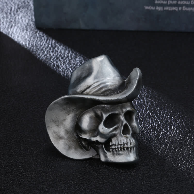 Questa fantastica fibbia è realizzata in metallo massiccio e raffigura un teschio con un cappello da cowboy.