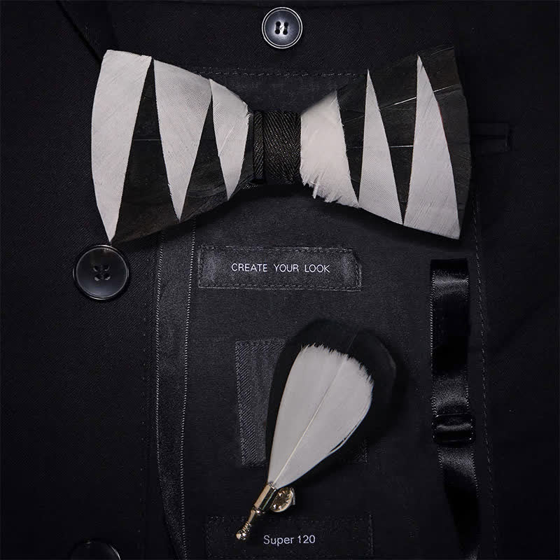 Con un design interamente fatto di piume, il papillon bianco e nero utilizza una nuova tecnica per creare angoli perfettamente simmetrici, per uno stile accattivante.