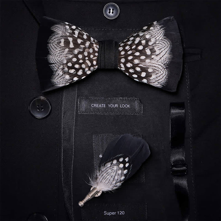 - Caratteristiche: L'aggiunta di piume a pois bianchi intrecciati sullo sfondo nero aggiunge un inaspettato elemento di contrasto e interesse, facendo sì che questo papillon si distingua dagli altri.